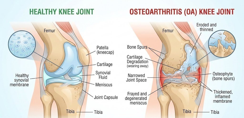 Ketika kartilago rusak, tulang dapat saling bergesekan dan menyebabkan nyeri, kaku, serta penurunan fungsi sendi.