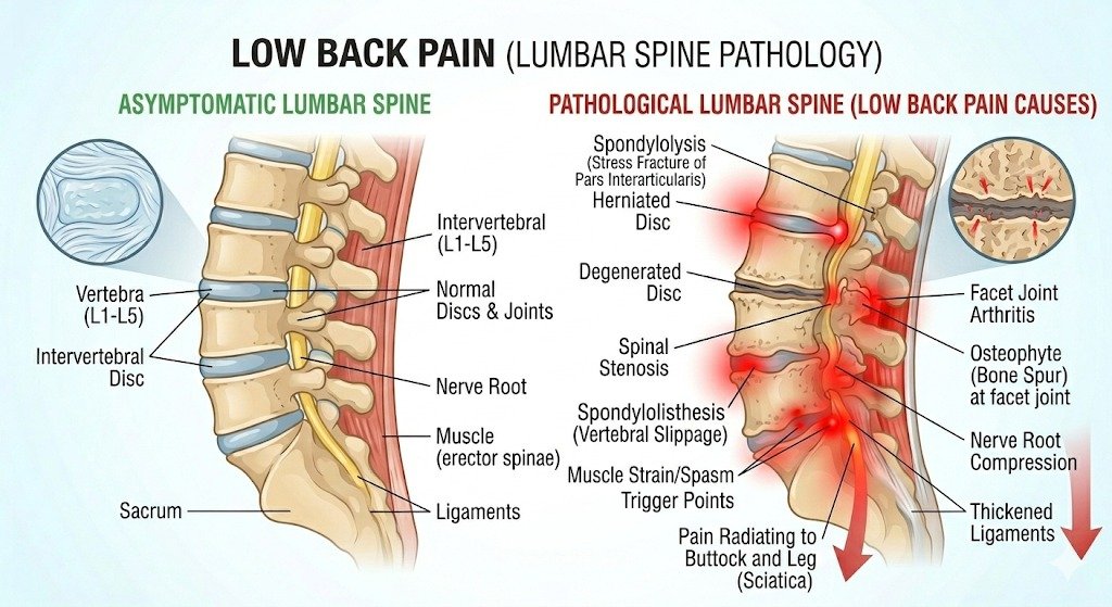 Low back pain dapat disebabkan oleh berbagai kondisi yang melibatkan struktur tulang belakang, otot, ligamen, saraf, dan diskus intervertebralis.